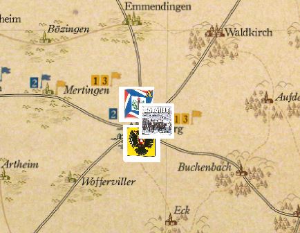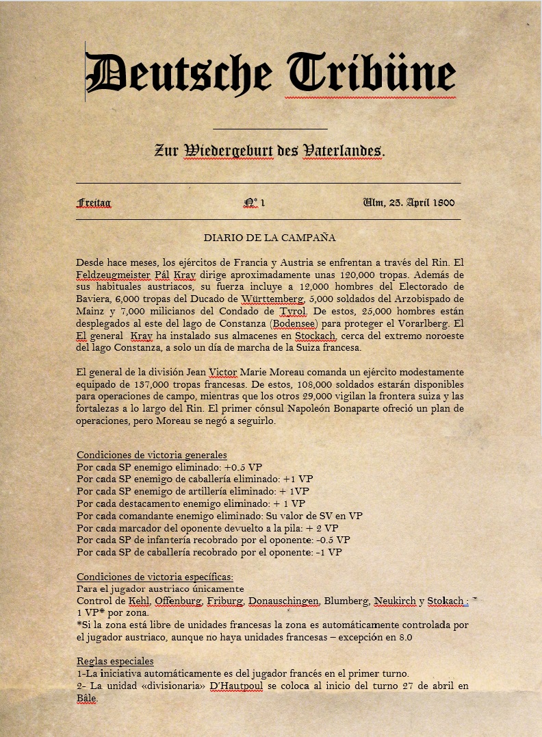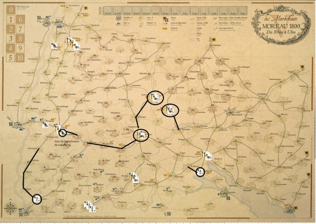 We follow generally the rules of the game, except in the case of the Moral and Event rules that were set aside. The scenario we played, the first, The crossing of the Rhine, that describes the beginning of Moreau\’s campaign as he attempts to gather together his dispersed troops. The Victory conditions, for Austrian player only, control de cities of Kehl, Offenburg, Friburg, Donauschingen, Blumberg, Neukirch and Stokach, being +1 VP per zone.