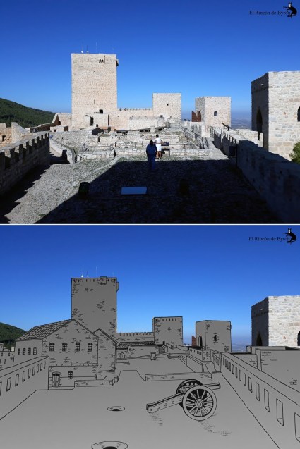 | Perspectiva interior de la fortaleza. La Torre Albarrana, primera a la izquierda y la Torre de la Vela, la primera por la derecha. |