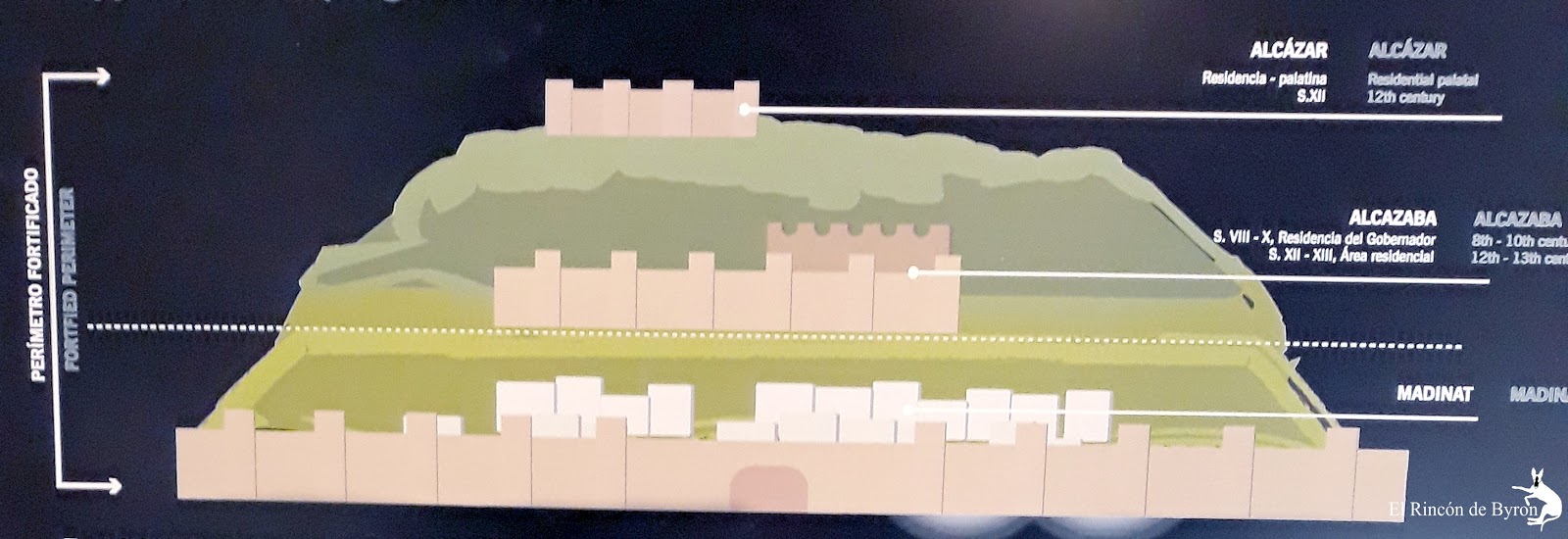 En la ladera del cerro de Santa Catalina se edificó la alcazaba, donde se ubicaba la residencia del gobernador de la ciudad en las épocas emiral y califal (siglos IX-X), separada de la madinat o ciudad por una muralla. En la cima del cerro, el alcázar dominaba el extenso territorio.