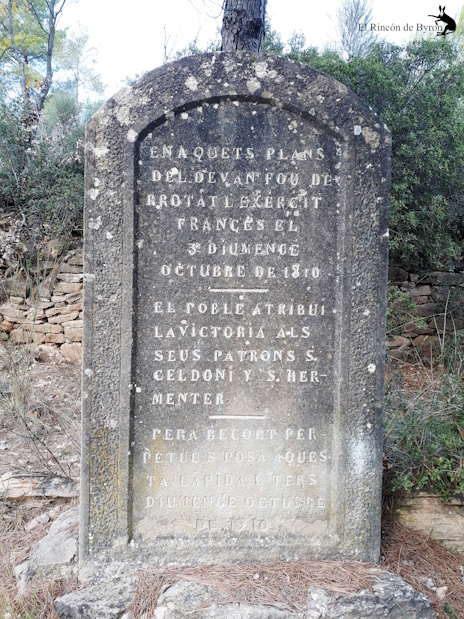 «EN AQUESTS PLANS DEL DEVANT FOU DERROTAT L’EXÈRCIT FRANCÈS EL 3R DIUMENGE OCTUBRE 1810. EL POBLE ATRIBUI LA VICTORIA ALS SEUS PATRONS S.CELDONI Y S. HERMENTER PER A RECORT PERPETUU’S POSÀ AQUESTA LÀPIDA’L TERS DIUMENGE OCTUBRE DE 1910«