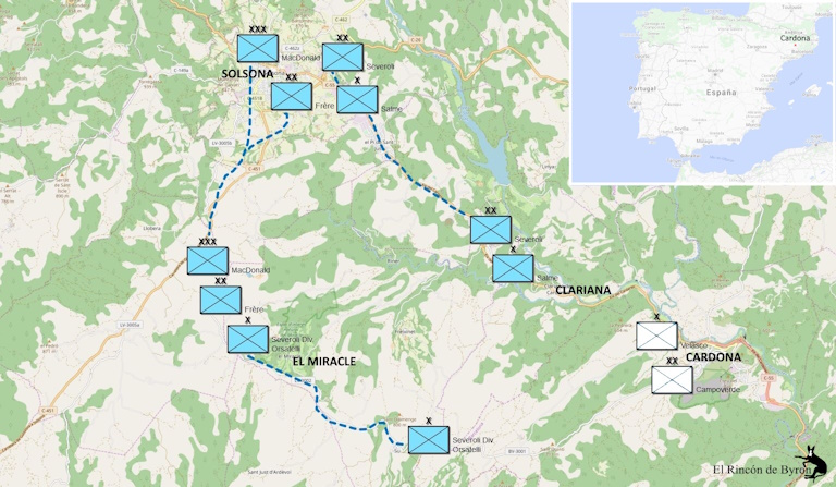 Así, en primer lugar, la brigada de Eugenio Orsatelli (de la división Severoli), se dirigió a la ermita del Milagro, desde donde avanzó hacia Cardona. Mientras tanto, el general Salme, con su brigada y el resto de la división italiana avanzaba desde Solsona por Hortoneda y Santa Susana, con el objetivo de dar apoyo a Eugenio. Finalmente, el grueso de la división Frère, con Macdonald, avanzarían también por la carretera de la ermita del Milagro. En principio, ninguno de estos cuerpos tenía que pasar más allá de la montaña de San Quintín.