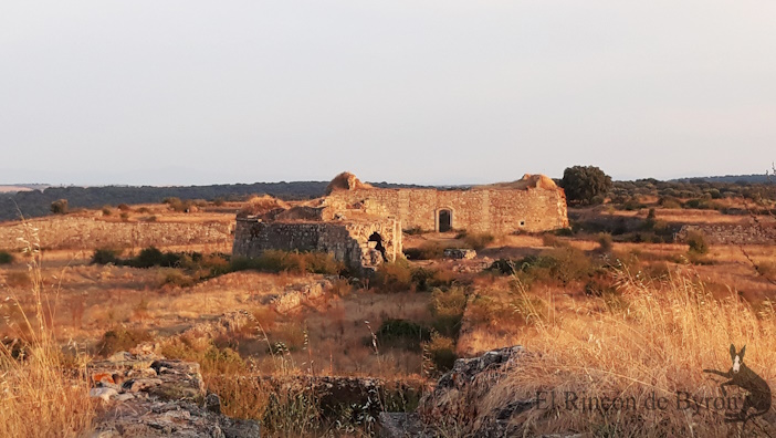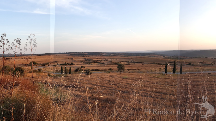 Panorama a la salida del recinto en dirección hacia el Norte. La población de Aldea del Obispo quedaría a nuestra derecha, fuera de la visión, a un escaso kilómetro. La frontera con Portugal estaría en el lado opuesto, a nuestra izquierda, también fuera de visión, a unos 500 m.