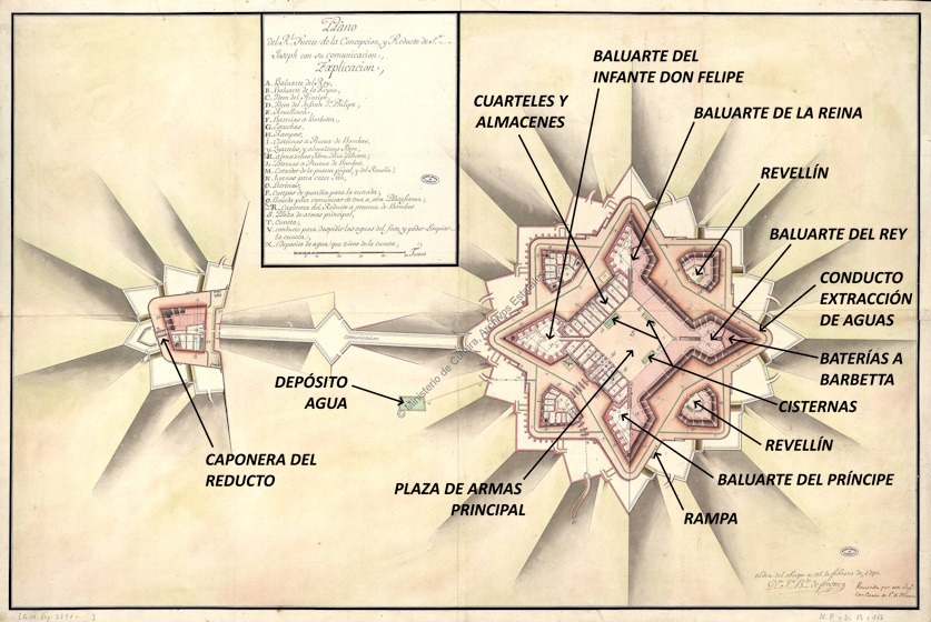 Plano del Real Fuerte de la Concepción y reducto de San José con su comunicación, del coronel e ingeniero Juan Bernardo Frosne, de 25 de febrero de 1740. El reducto de San José fue levantado para ganar la altura del Cerro de la Cruz, a una cota superior que el resto del fuerte. Frosne también fue encargado puntualmente de las dirección de las obras. (c)