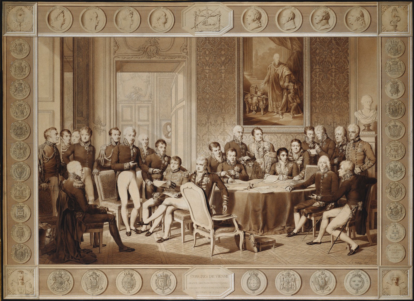 Una acuarela que muestra a los delegados en el Congreso de Viena. El Congreso se reunió después de la abdicación de Napoleón. Asistido por todas las grandes potencias europeas, incluida Francia, el Congreso declaró a Napoleón fuera de la ley y trabajó para renegociar las fronteras nacionales que habían sido desarregladas por las campañas militares del Emperador. Este retrato grupal de los delegados muestra el momento (el 3 de febrero de 1815) cuando el duque de Wellington (extremo izquierdo, de perfil) llegó para tomar el mando de la delegación británica de Castlereagh (sentado en el centro, mirando a la izquierda). Pero cuando el Congreso concluyó en junio de 1815, Napoleón había escapado de Elba y regresaba a París. Las esquinas del borde presentan los símbolos de Verdad, Prudencia, Sabiduría y Justicia. El borde superior incluye a los gobernantes del Reino Unido, Austria, España, Francia, Portugal, Prusia, Rusia y Suecia. El borde inferior contiene los escudos de estos gobernantes. La acuarela fue encargada por el delegado francés en el Congreso, Charles Maurice de Talleyrand, pero permaneció en posesión del artista hasta que George IV la compró en 1820. (e)
