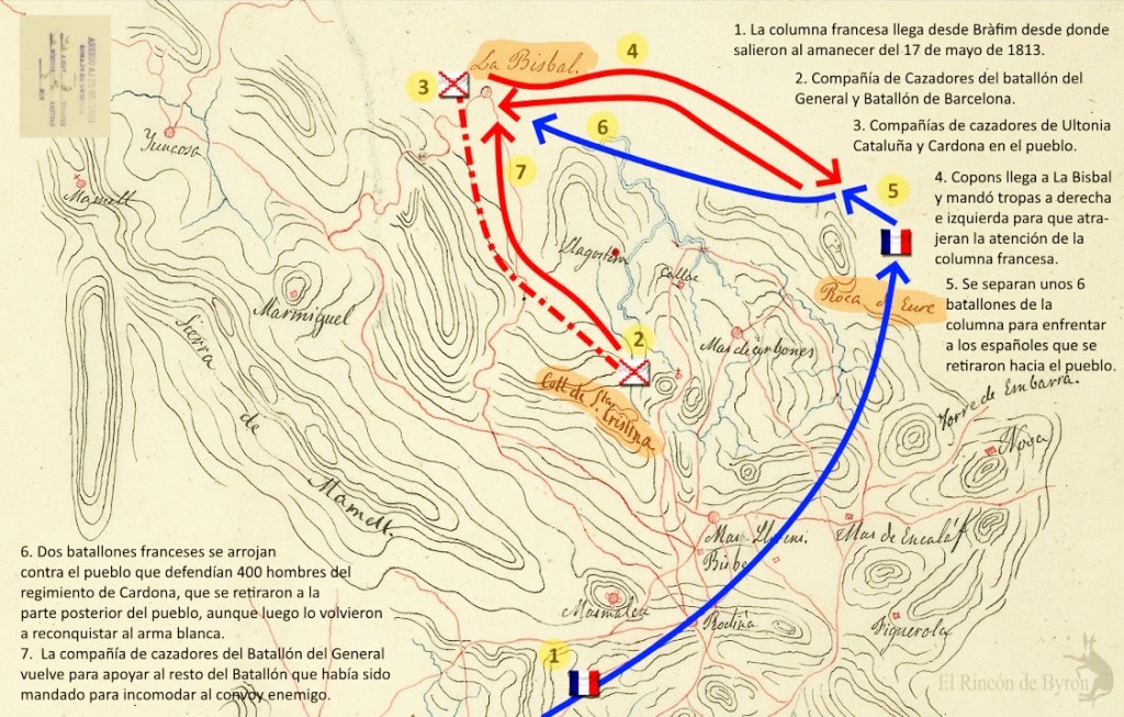 Informado el Sor. General en Gefe de la dirección de los enemigos, salió de Villafranca una hora antes de amanecer el dia 17 acompañado de su Estado Mayor y un destacamento de 20 Húsares. Al llegar á la Bisbal tuvo noticias de que los enemigos iban ya baxando por el Coll de Roca de Eura, que pasa por detrás de la altura de la atalaya, y en efecto á poco rato se vieron algunos de sus descubridores en la misma atalaya. Vista ya la dirección del enemigo, y que solo deseaba se le dexara pasar impunemente sin comprometer una accion, reconcentró sus fuerzas el Sor. General en Gefe, y mandó destacamentos por derecha e izquierda que insultaron á los enemigos en su mismo camino, obligandoles á venir sobre nuestras fuerzas con parte de las suyas. Todo se verificó puntualmente, mereciendo atencion el abance dado por la compañía de Cazadores de Cataluña bajo la direccion de los subtenientes Dn. Manuel Ernando y Dn. Alexo Valls, sobre el molino camino del coll sostenida por la de Ultonia. Los enemigos se presentaron luego en tres distintas alturas con unos seis Batallones y salieron otros dos en columna á cargar los destacamentos españoles: Estos se vinieron replegando con el mayor orden sin cesar de hacer fuego en retirada, y orgullosos los enemigos se arrojaron sobre la Bisbal con dos Batallones, uno por el bosque camino del coll, y otro que descendió de una altura inmediata á la de la atalaya, verificando con enorme gritería y estrepitoso ruido de las bandas de tambores. Quatrocientos hombres del Cardona, que á las ordenes de su Gefe Dn. Miguel de Cordova, se hallaban en el pueblo lo defendieron con serenidad, retirandose con un vivo fuego y mucho orden al escalon inmediato al mismo tiempo que por la izquierda y derecha lo verificaban los destacamentos que habían provocado al enemigo, sostenido el de la derecha por un escalon de Cazadores de Cataluña, y el de la izquierda por un destacamento de 30 caballos de coraceros y Husares que había reunido el capitán agregado al Estado Mayor Dn. Ramon Albareda de la escolta del Sor. General en Gefe, y de una partida que estaba en la Bisbal, y que pasó á las ordenes del Tente. De Husares Dn. Alfonso Silva.