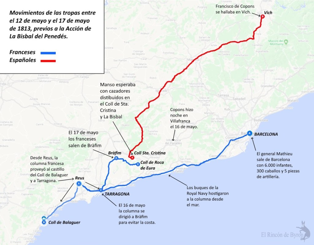 Hoy, 17 de mayo de 2020, hace exactamente 207 años que se dirimió la Acción de la Bisbal del Penedés, el 17 de mayo de 1813, entre 2 brigadas españolas al mando del mariscal de campo Francisco Copons y una columna francesa al mando del general de división Maurice Mathieu que había conducido desde Barcelona un convoy que había aprovisionado las guarniciones del fuerte del Coll de Balaguer y la plaza de Tarragona, ambas en poder de los franceses.