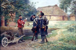 \»Este es un trabajo excepcional en óleo sobre panel que representa con colores vivos y detalles perfectos a un par de soldados que entregan un boleto de alojamiento a un compatriota. Ambos soldados parecen rendidos por el cansancio, sucios y sudorosos por el calor mientras el viejo caballero digiere el significado de las palabras en papel. El resto del fondo se desvanece a partir de este momento, solo insinuando las superficies de las cabañas de las aldeas rurales en el fondo y el camino serpenteante sobre el que las gallinas se extienden libremente, mientras que en el frente las tres figuras se dibujan absolutamente nítidas, con vida y expresión intensas. Todos los aspectos de los soldados y la figura se capturan con claridad, desde sus aretes en las orejas hasta las características marcadas de la anciana figura, los pies y las piernas gastadas y embarradas de los soldados y la aparatosidad de sus mochilas y armas. La escena es intensa, pero tan pacífica y nostálgica en el entorno romántico del campo.