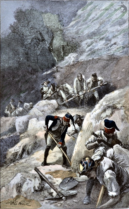 (Izquierda): \»Excavando el camino en el Paso de San Bernardo\», grabado en color (t)