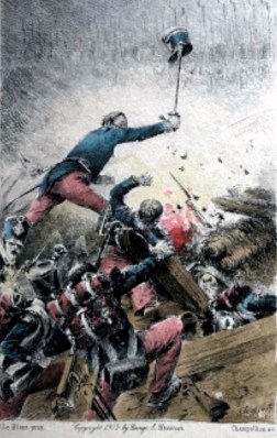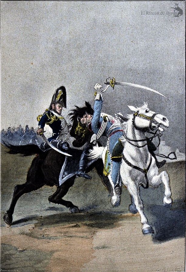 (Izquierda): \»Coignet mata a un oficial prusiano con el sable\», grabado en color (v)