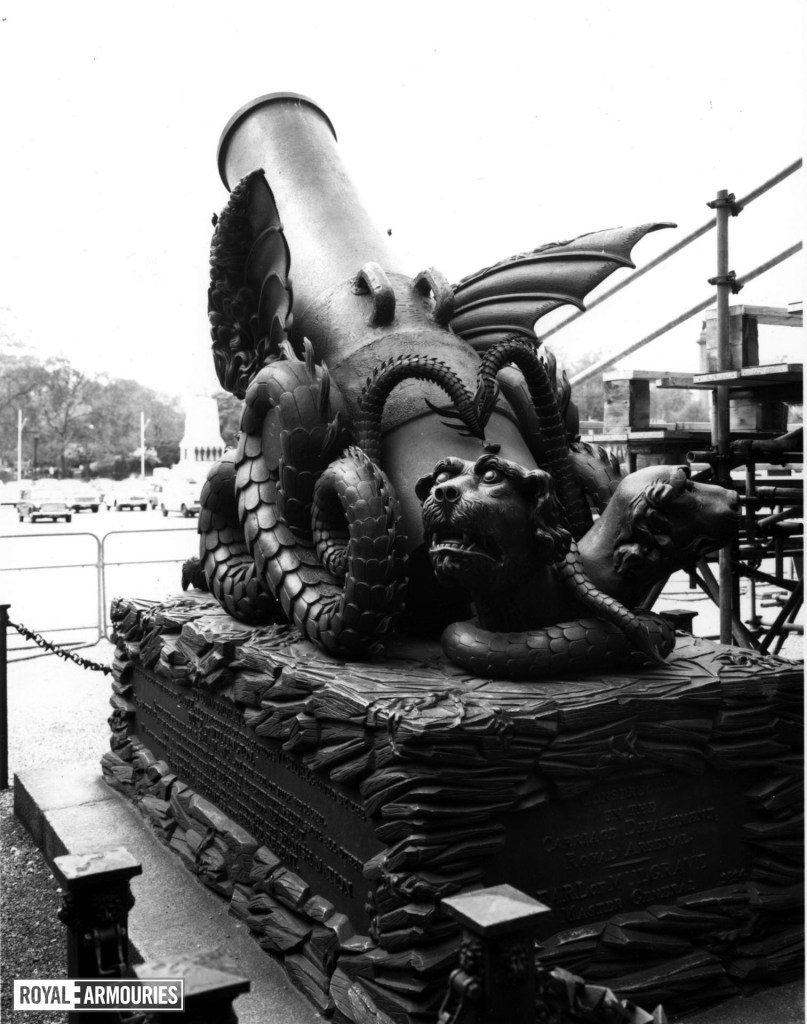 (Izquierda): Obús de 11″ a la Villantroys en el Horse Guards Parade en Whitehall (b). Este montaje fue diseñado por Robert Shipster, dibujante del Real Departamento de Carruajes, ubicado en Woolwich, en 1812. Originalmente estaba destinado a ser de hierro, y finalmente fue fundido por el Departamento en bronce a partir de un antiguo cañón usando un molde preparado en la Real Fundición. Según un folleto contemporáneo, «Hone’s View of the Regents Bomb» (La mirada de Hone de la bomba del Regente) (n.d.), el mortero pesaba 5 toneladas y el pedestal 5,5 toneladas [3]