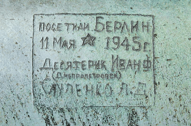 En mayo de 1945, después de la batalla de Berlín, el ejército soviético capturó las dos piezas, ahí se ven las imágenes en la pantalla, así que son algunos soldados soviéticos que firman un graffiti en las piezas y permiten así dejar un rastro de su paso por Berlín, así que hay varios graffitis en las piezas, varios en cada una. Les he puesto algunas, cada vez es el mismo principio indicativo del paso por Berlín, la fecha y luego el nombre de los soldados, así que aquí está, el 11 de mayo del 45, aquí está el 7 de mayo y luego por último el 13 de mayo, así que igual invita a ir a ver las piezas que han ayudado a otros a decir que son un testimonio de esta batalla de Berlín, está la presencia de estos obuses en este lugar. En 1946 el general Kulikov, comandante del gran Berlín, restituye estas piezas a las autoridades francesas que las envían al Museo del Ejército, donde entran en las colecciones el 6 de enero de 1947, así que estas son las piezas expuestas en el patio de los Inválidos a partir del año 1947.