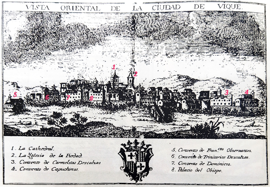 «Vista oriental de la ciudad de Vique», grabado de principios de siglo XIX, donde se ve la ciudad de Vich desde el otro lado del rio Méder, con el palacio Episcopal en primer término. (b)