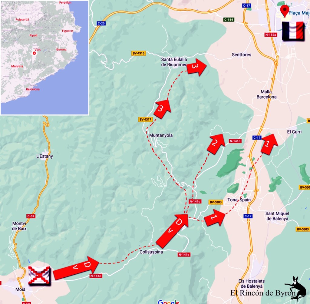 3«El mariscal Augereau (duque de Castiglione) había llegado a Cataluña casi al final del asedio de Gerona. A pesar de algunos éxitos de Souham contra los miqueletes y somatenes en Besalú, Ripoll, Olot, etc., cambió el sistema de concetración de tropas que había tenido su predecesor y creyó que ya podía ocupar todo el pais. Quiso tener fuerzas por todos los lugares, ocupar todas las comunicaciones, y desde su cuartel general establecido en Barcelona le pareció fácil ordenar movimiento militares según las circunstancias. Se ordenó a la división italiana el poner cerco a Hostalrich y la división de Souham fue a Vich para dominar aquel vasto altiplano y mantener la montaña.» [9]