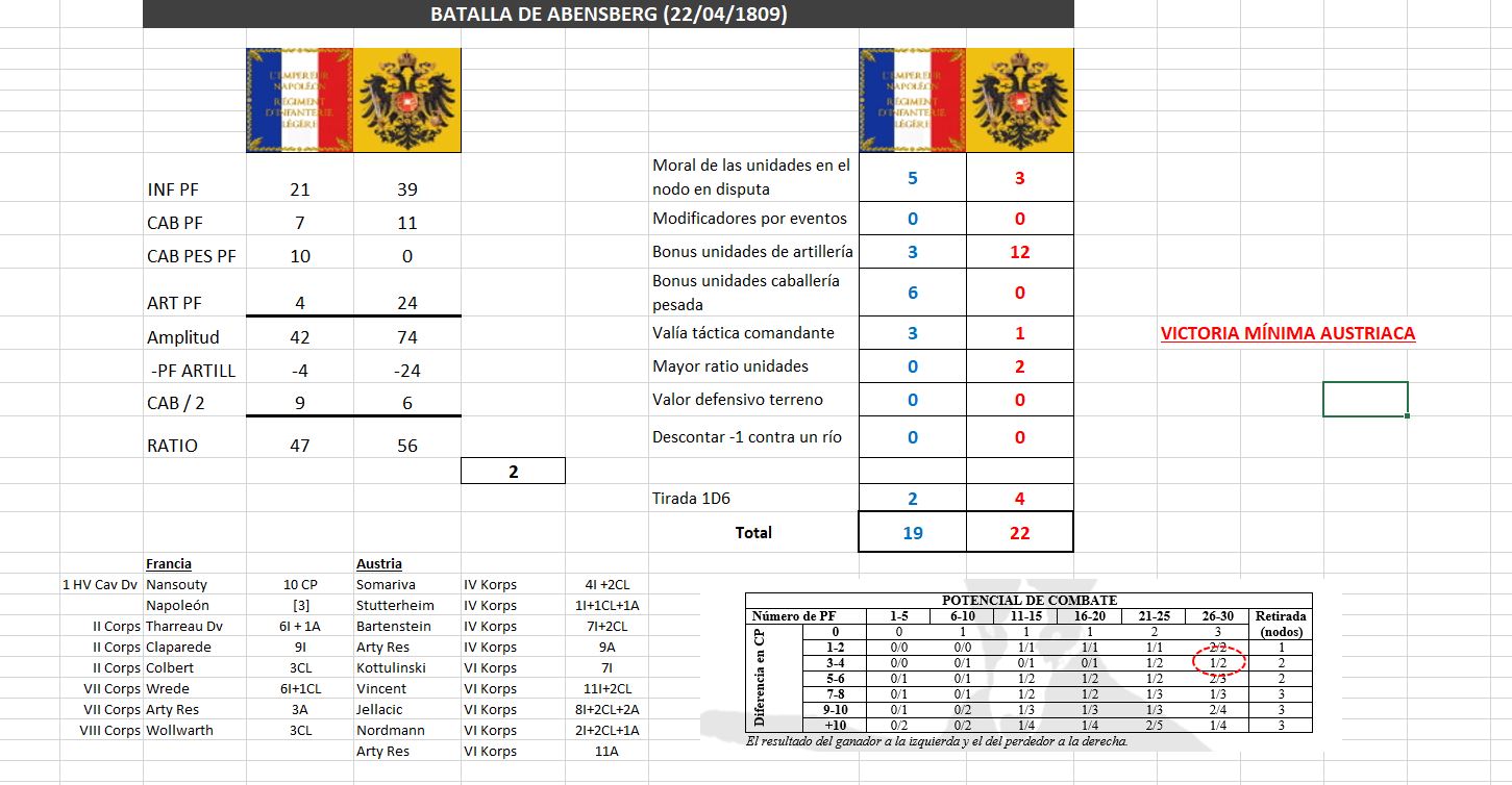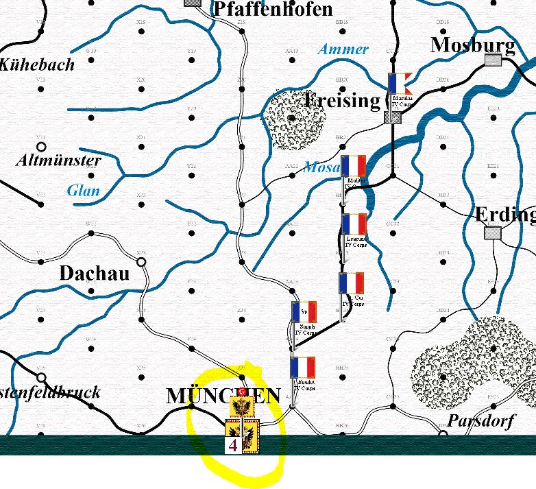 Napoleon (7PO) decides to knock down the bridge after the troops have passed and head towards Kösching, near Ingoldstadt, followed by Vandamme (3PO) and Lefevbre (4PO). Masséna (4PO) must retrace his steps over Munich and try to regain the city. Davout (3PO) concentrates his forces in Hemau to try to conquer Regensburg, hoping that Napoleon will support him.