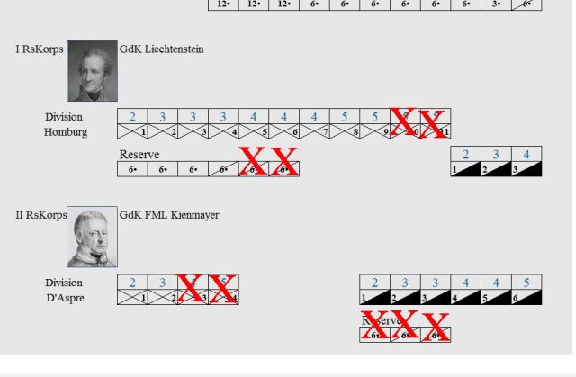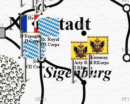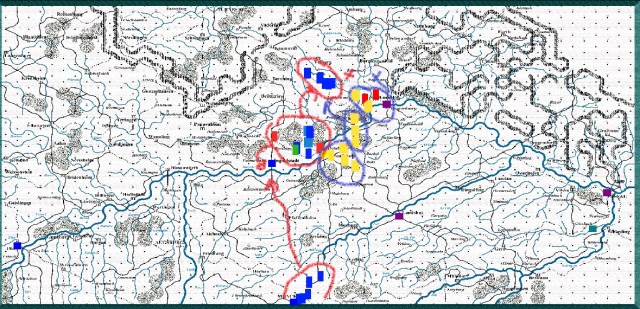 Hiller\’s VI Korps (5PO) heads north, followed by Rosenberg\’s IV Korps (3PO). The rest waiting, being able to continue along the southern bank of the Danube towards Ingoldstadt or accompany Hiller and Rosenberg north.