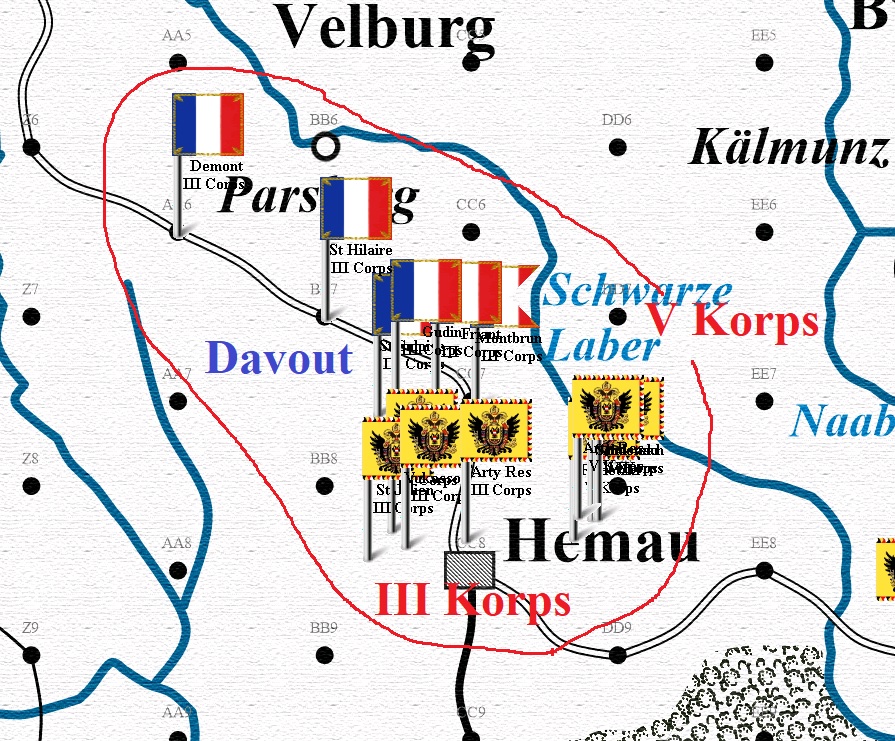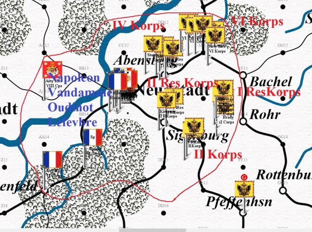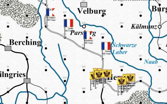 Masséna (7 PO) makes a forced march to try to join Lefevbre\’s body. Napoleon (8 PO) with Oudinot\’s corps also heads towards Abensberg with another forced march. Vandamme (6PO) in turn makes a forced march to join the Emperor. Davout (8PO) heads towards Regensburg, to attract the units that surround the city. The outposts of the Friant Division (II Corps) contact 3 decoys which happen to be the Austrian III Korps in Hemau, the V Korps, 10 km behind and a decoy with “Aggressive Action” that is retired.
