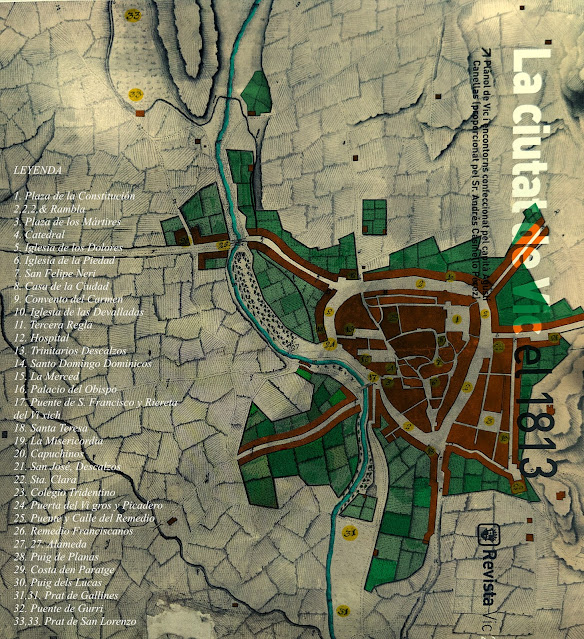 (II) – “Casi en el centro de esta grande area está situada la antigua ciudad de Ausona, que posteriormente tomó el nombre de Vich dando denominación a todo su territorio. Esta ciudad ofrece á la vista una figura muy irregular por la gran prolongación de sus calles exteriores, que alargandose desde el grupo de casas que forman el centro por la dirección de los caminos principales que salen de ella, se extienden a gran distancia por todas partes.