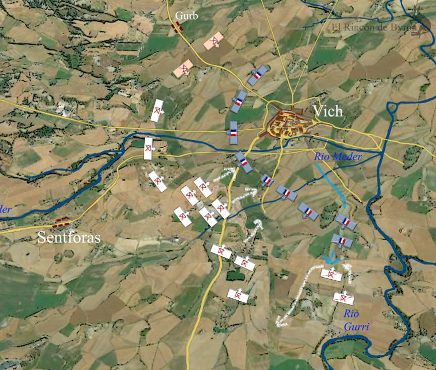 «Outre ces trois colonnes, les Miquelets et Soumatins, sous les ordres de Rovira, couvroient les hauteurs, et une partie devait attaquer Gurp. ou est stationné le 4e. bataillon du 3e. régiment d’infanterie de ligne. Lors que le général de division Souham a été a peu-pres certain des mouvements de l’ennemi, il a réuni dans la plaine, immédiatement au dessus de Vich, toute sa division. Le 42e. régiment d’infanterie de ligne au centre, le 1er. regiment d’infanterie légere a droite, le 4e. bataillon du 93e. appuyant le 1er. léger, la cavalerie soutenant les trois pieces d’ artillerie et les ailes de la division«