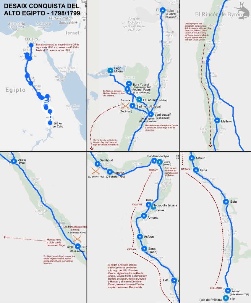 Tras el retorno de Bonaparte, Desaix aceleró los preparativos para apoderarse del Alto Egipto, donde se refugiaba el derrotado Mourad Bey. Siguiendo el curso del Nilo, llevando como generales y jefes de brigada a Belliard, Friant, Davout, Boyer, Lasalle y Le Tournerie (Vivant-Denon también iría con la expedición) y con el apoyo de una flotilla, desciende desde el puerto de Boulac en el Cairo el 25 de agosto hasta Girgé (Girga), el 29 de diciembre, donde compra dos jóvenes chicos esclavos de raza negra que le acompañarán a partir de entonces hasta Marengo.
