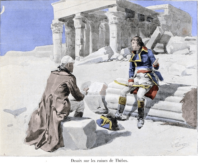 1800 – Finalmente el 24 de enero Desaix firma la Convención de El Arish8, y tras volver a El Cairo, descendió el Nilo acompañado de Rapp y Savary y los dos chicos negros llegando a Rosetta, donde estaba el general Menou, este último habiendo abjurado del cristianismo, y adoptado el nombre de Abdallah. De Rosetta, Desaix llegó a Alejandría donde preparó su partida, esperando los pasaportes de Sydney-Smith. El 28 de febrero llegó el Osiris, un brick procedente de Francia con la noticia del golpe de 18 de Brumario que llevaba el coronel Víctor de Latour-Maubourg y que siguió su ruta hasta El Cairo. Pidiendo insistentemente sus pasaportes, finalmente, el 3 de marzo Davout y Desaix embarcan en dos barcos mercantes y abandonaron Egipto para siempre.