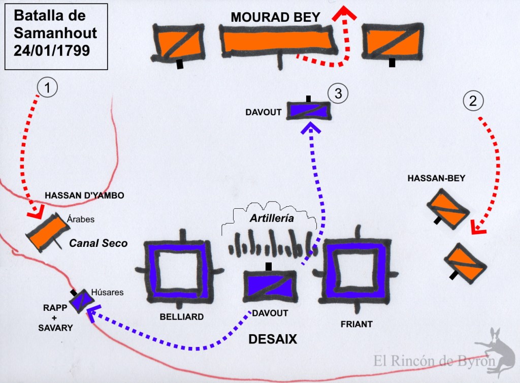 1799 – El 22 de enero en la batalla de Samanhout vence a Murad Bey, y prosigue su persecución por las villas de Denderah, hasta la antigua Tebas y Luxor, llegando hasta Assuan, en los límites de Egipto el 1 de febrero de 1799. La lucha contra Murad Bey era constante, ya que, pese a las victorias francesas, Mourad con sus mamelucos siempre aprovechaba para intentar atacar a los franceses. Desaix distribuyó a sus tropas entre Assuan (Belliard), Kena-Keneh (Friant), Tebas (Davout) y él mismo en Esneh. Tras varios encuentros contra Murad o sus lugartenientes entre marzo y finales de abril, Desaix, tras la victoria de Byr-el-Bar establece su cuartel general en Quena (Keneh).