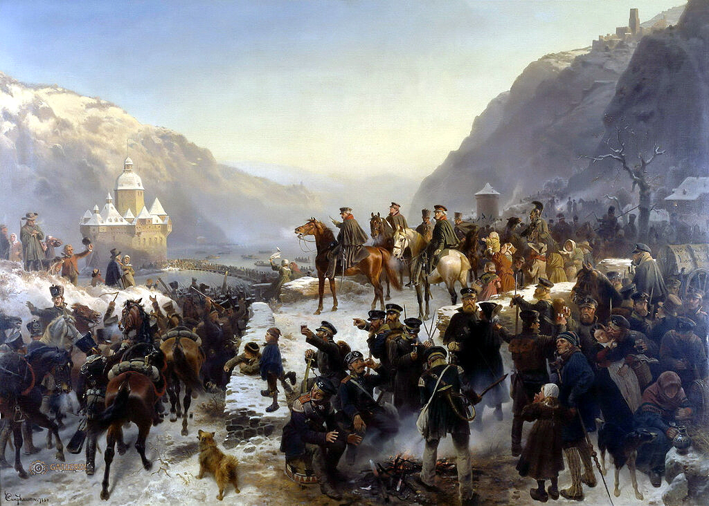 | “Blücher cruzando el Rin con el 1er Ejército de Silesia cerca de Kaub en enero de 1814” (1859), óleo sobre madera, 145×210 cm (f) |