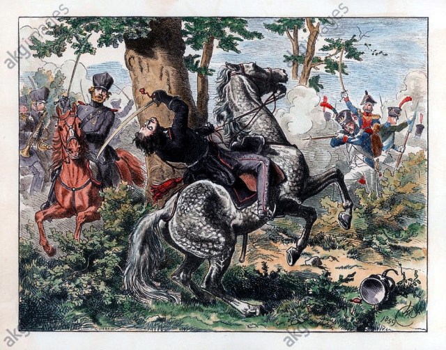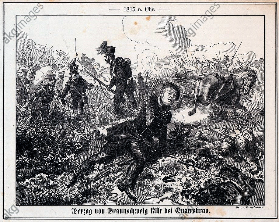 | \»El Duque de Brunswick cae en Quatre-Bras\» (1860), grabado sobre madera (g) |