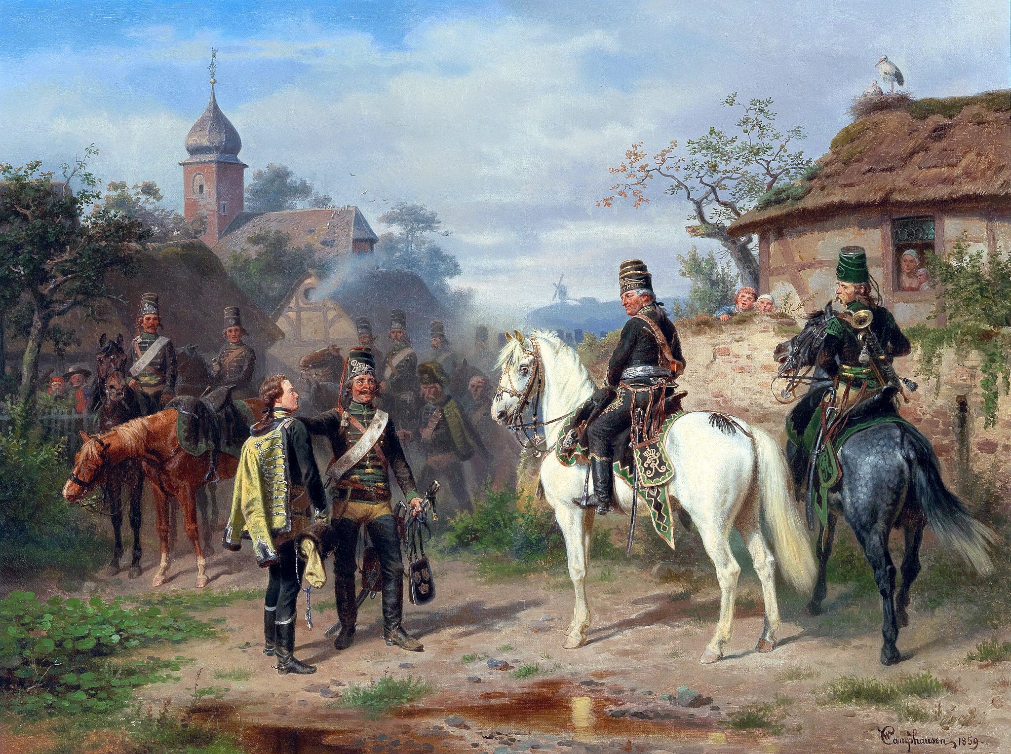 El artista se inspiró de nuevo en un período anterior de la historia alemana y produjo el muy apreciado \»Desfile en Potsdam ante Federico el Grande\» (en el Castillo Real de Berlín); \»Federico el Grande y el regimiento de dragones de Bayreuth en Hohenfriedberg\», \»Federico ante el cuerpo del general Schwerin\»; \»Ordenanza al galope, jinete que llega al galope sobre el espectador\», un cuadro muy notado en la Exposición de 1866. Citemos también \»La toma de un estandarte austriaco cerca de Nachod\»; \»Encuentro del príncipe Federico Carlos y el príncipe real de Prusia, en las alturas de Chlum\»; los retratos ecuestres a tamaño natural de Federico el Grande (sala de desfile del Palacio de Berlín), el Gran Elector y el Kaiser Guillermo (museo de Colonia). Entre las obras que reproducen los acontecimientos de la guerra de 1870, mencionemos a \»Napoleón en el fuego, en Sedán\», \»Encuentro de Bismarck y Napoleón\»; \»Retrato ecuestre del emperador Guillermo en Gravelotte\»; \»Entrada del emperador en Berlín, con numerosos retratos\»; etc. Ha publicado dibujos llenos de espíritu y buen humor en publicaciones como el \»Dusseldorfer Monatshefte\», el \»Künstleralbum\», etc. Desde 1859 Camphausen fue profesor en la academia de Düsseldorf y miembro de las academias de Berlín y Viena. Le debemos, como escritor, \»El pintor en el campo de batalla\» (Bielefeld, 1865): también durante muchos años dirigió la publicación de la crónica ilustrada \»der Malkasten\». Murió en la misma ciudad de Düsseldorf, el 18 de junio de 1885. [1]