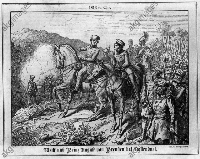 | \»Kleist y el príncipe Augusto de Prusia en Nollendorf\» (1860), grabado sobre madera (i) |