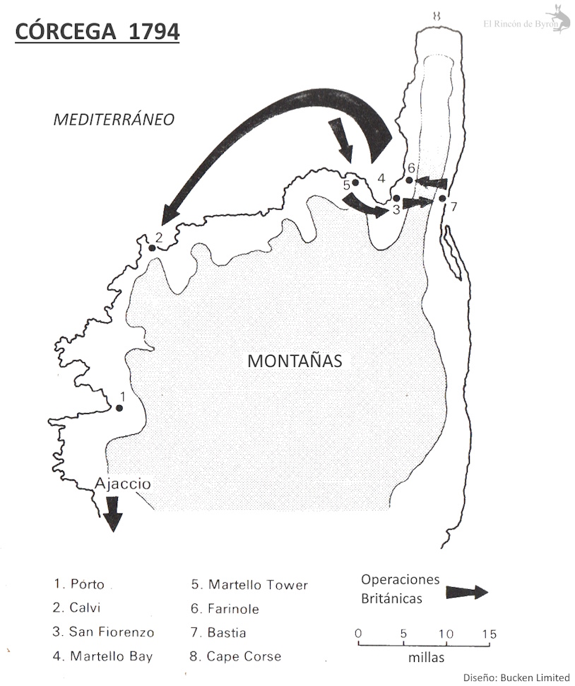 1794 – El 14 de enero una fragata zarpó hacia Córcega, con Moore, Gilbert Elliot, comisionado por la Corona en el Mediterráneo y Koehler, un oficial de artillería, para comprobar la posibilidad de un ataque en la isla e intentar contactar con Paoli. El encuentro con Paoli fue amigable, y el grupo pronto reconoció varios lugares de la isla, junto con 40 guerrilleros y Pozzo de Borgo, amigo de Paoli y rival de los Bonaparte. Moore permaneció algunos días examinando la costa, y se reunió con la flota inglesa, dando su reporte para planear la invasión que, pensaba, habría de iniciarse en la bahía de Martello.
