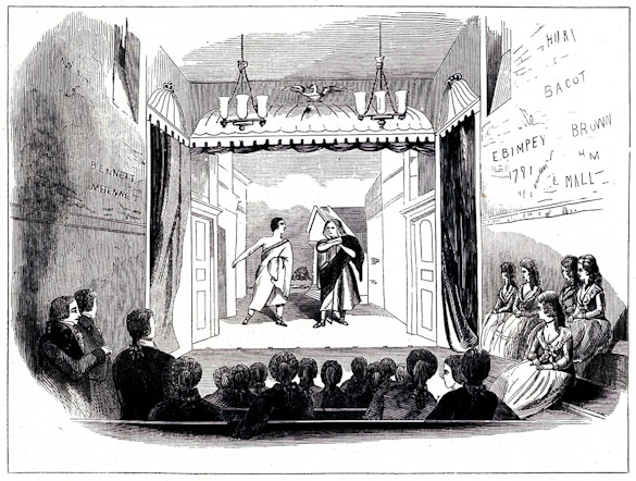 «… se emitirán boletos para el foso y palcos. Nos movimos en grupos bacanales hacia “el teatro”. Estaba abarrotado en exceso, ya que no nos habíamos olvidado de reservar algunos asientos para “los soldados”. Tan pronto como se alzó el telón, la maravilla de las “muchachas” no conoció límites y llegó a ser tan locuaz en admiración por el escenario y los vestidos y disputando entre ellas cuál era «El Príncipe», y cuáles de los diversos personajes eran interpretados por oficiales, por lo que pasó un tiempo considerable antes de que se tranquilizaran lo suficiente para permitir comenzar, que, sin embargo, fue con un gran éclat.