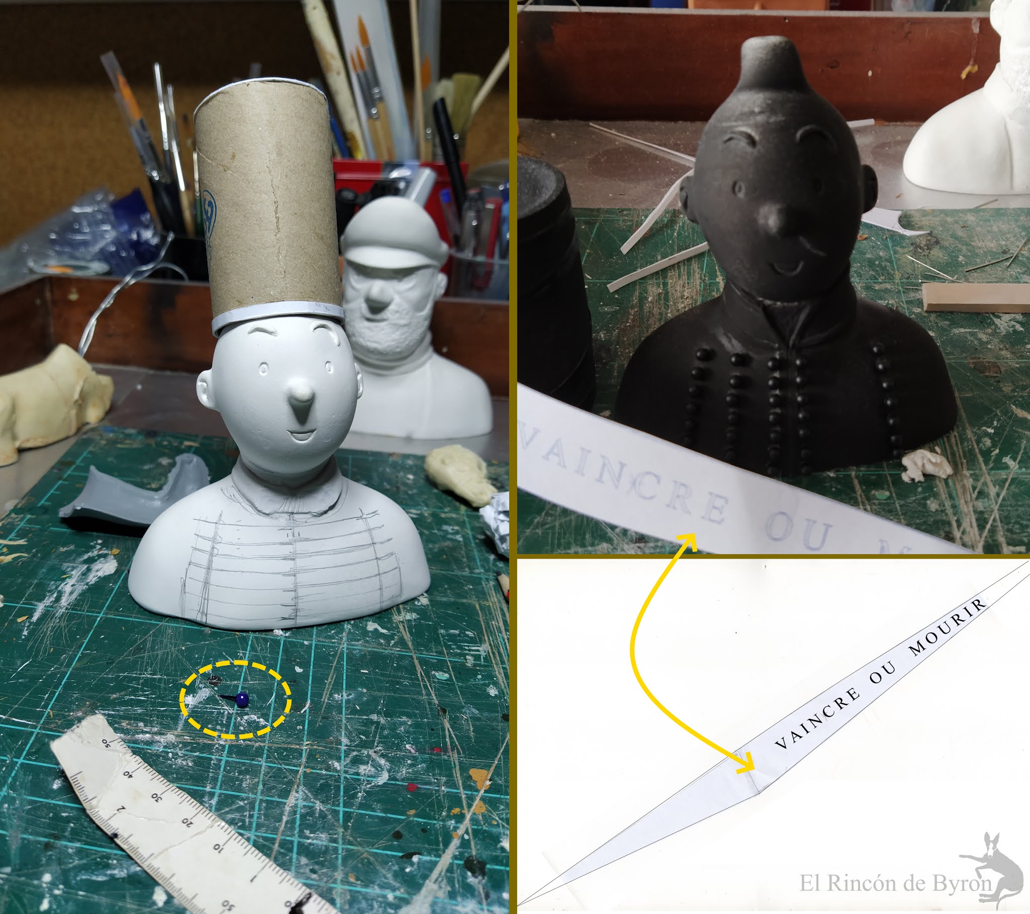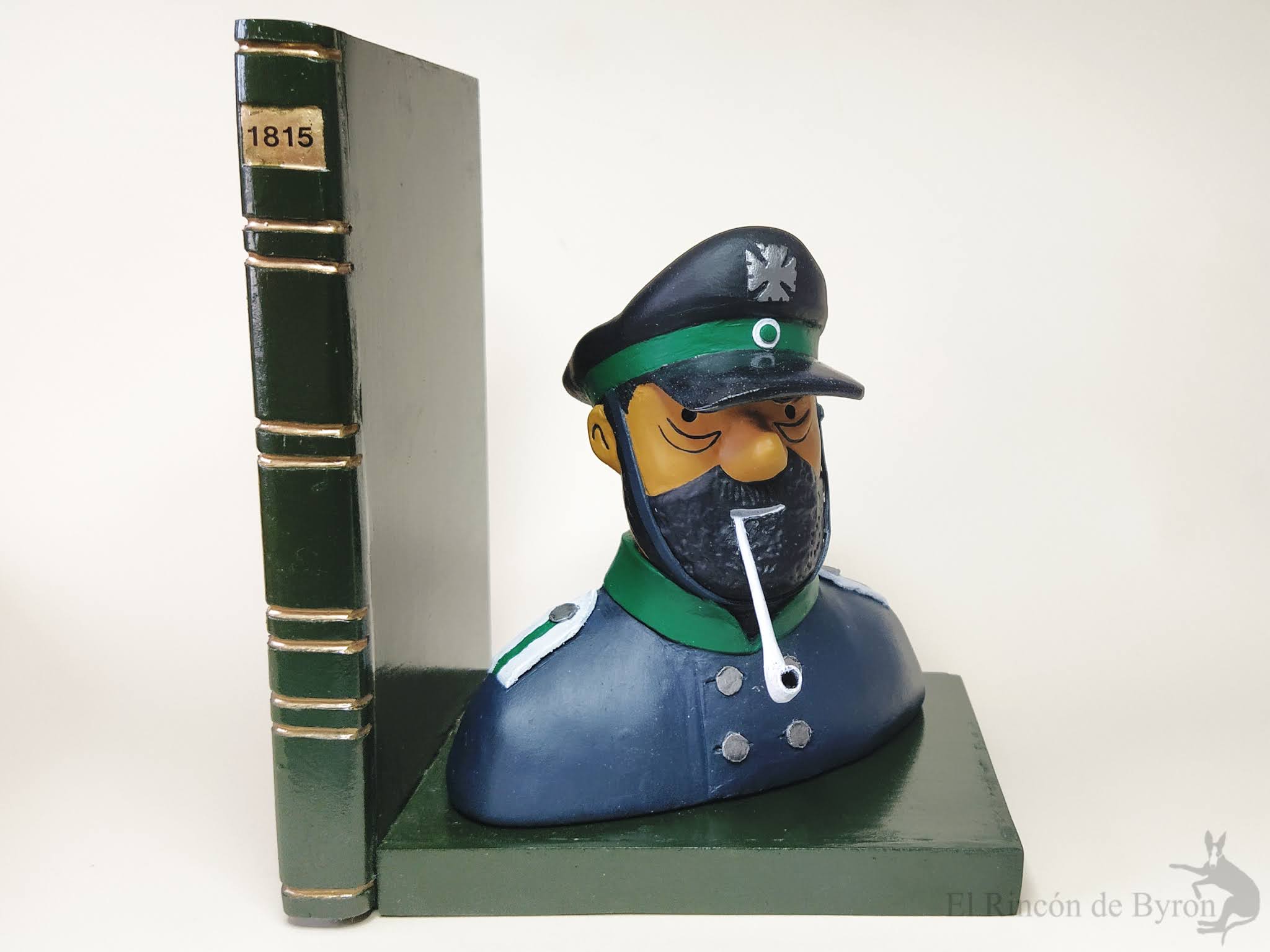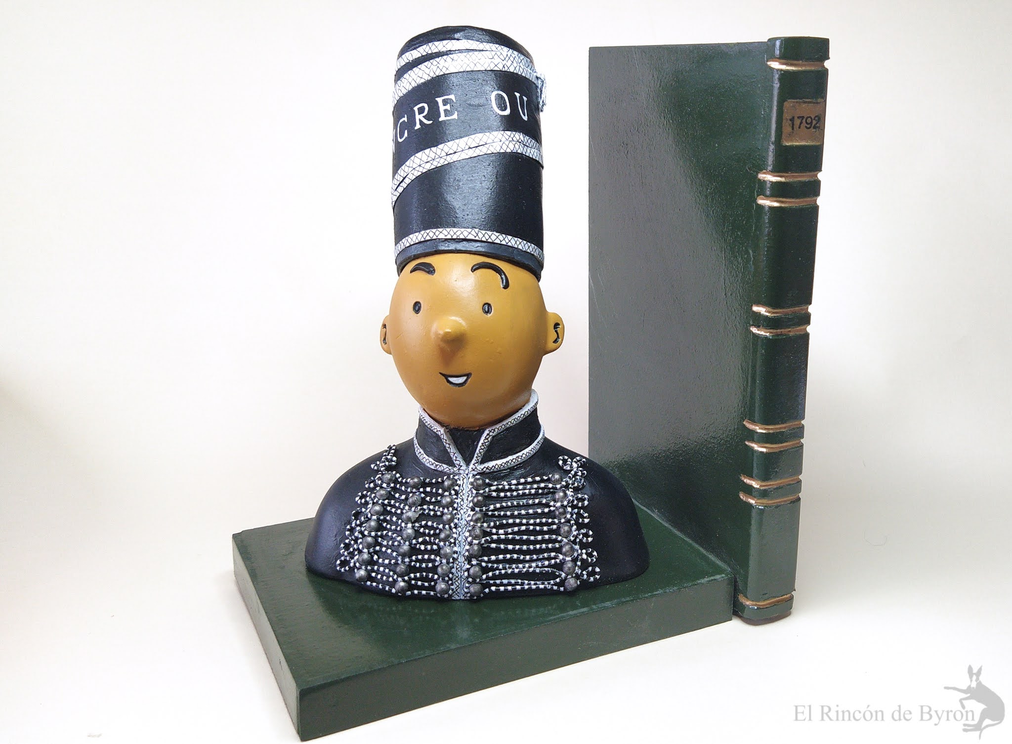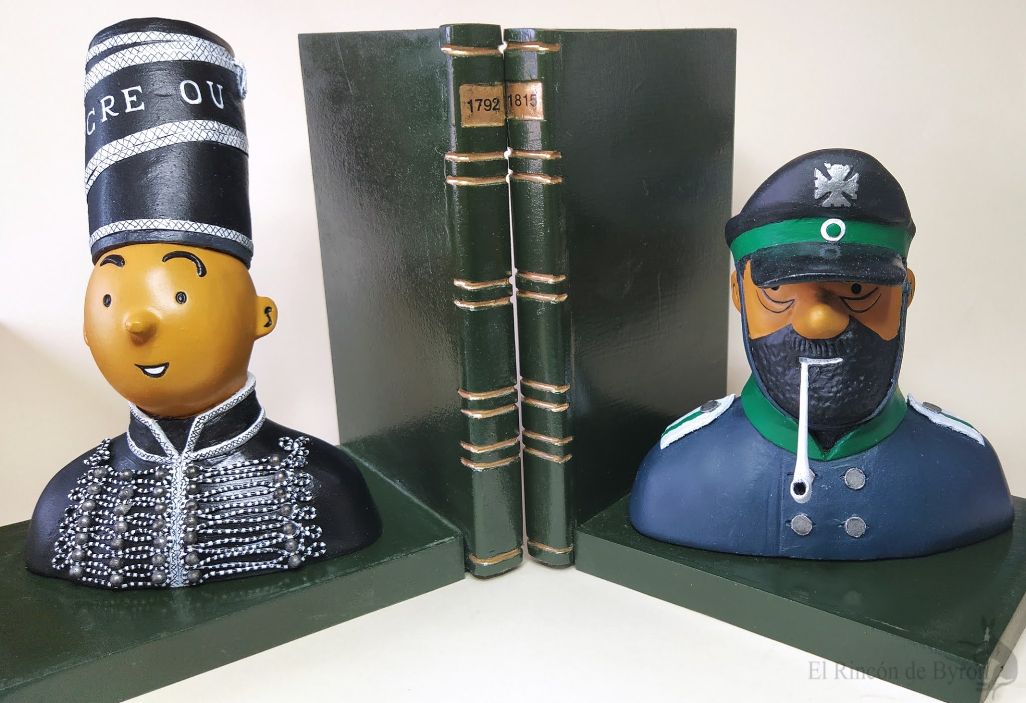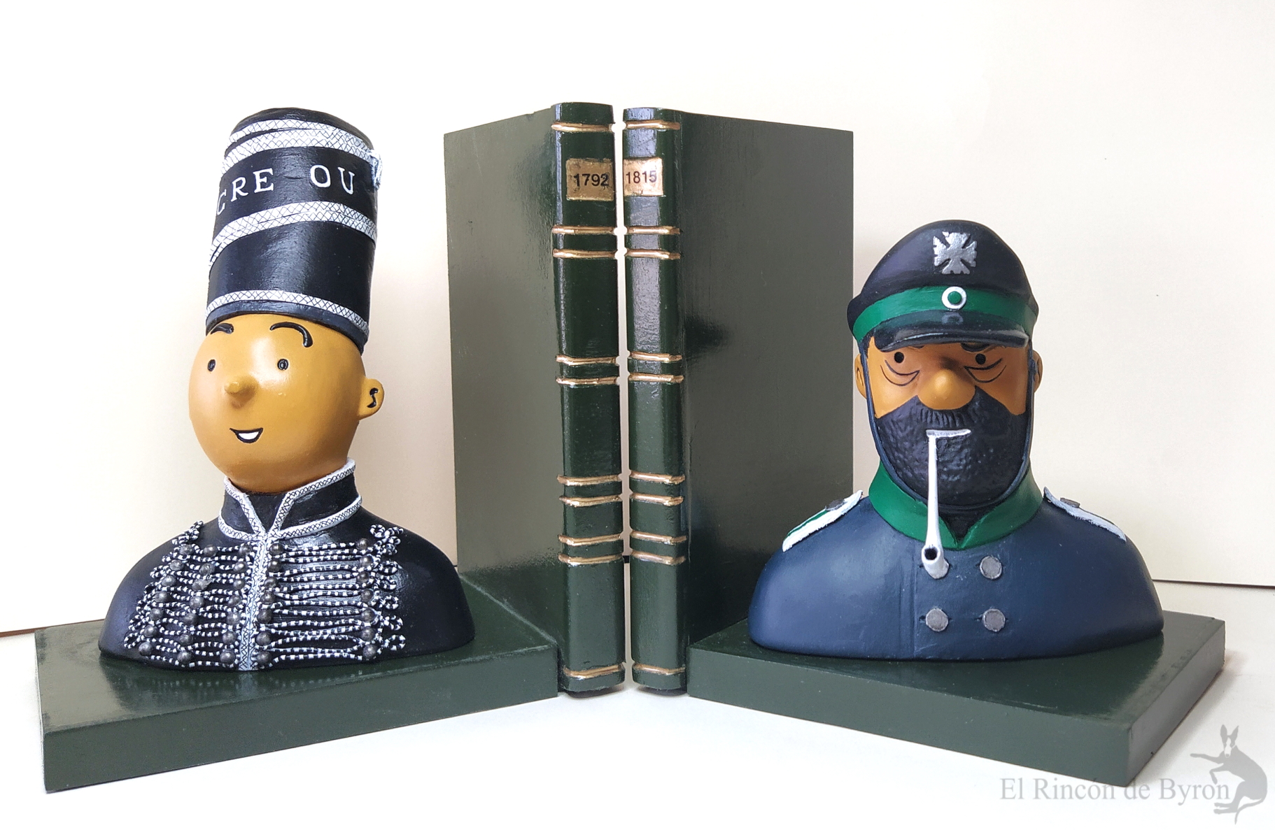 La idea original (y tópica) era hacer un granadero de la Vieja Guardia Imperial francesa con el capitán Haddock, pero hubiera requerido una transformación más elaborada y de más tiempo. Siendo como era un busto muy simple en sus líneas, y con la presencia de la sempiterna gorra del capitán, lo adaptamos para que fuera un miembro de la Landwehr (milicia) prusiana de las guerras de 1813 a 1815, con lo cual también justificaba la fecha del lomo. La Landwehr eran las milicias formadas por hombres desde la edad adolescente hasta los cuarenta años. Eran reclutados entre los hombres de campo y en las ciudades y enrolados en la maquinaria militar prusiana para ampliar las fuerzas del ejército tradicional y poder equipararse en números a las tropas de la Grande Armée de Napoleón y sus aliados. La milicia a pesar de su carácter estaba bien entrenada y sobretodo motivada para vengar tanto las derrotas pasadas como los años de invasión y ocupación de los franceses.