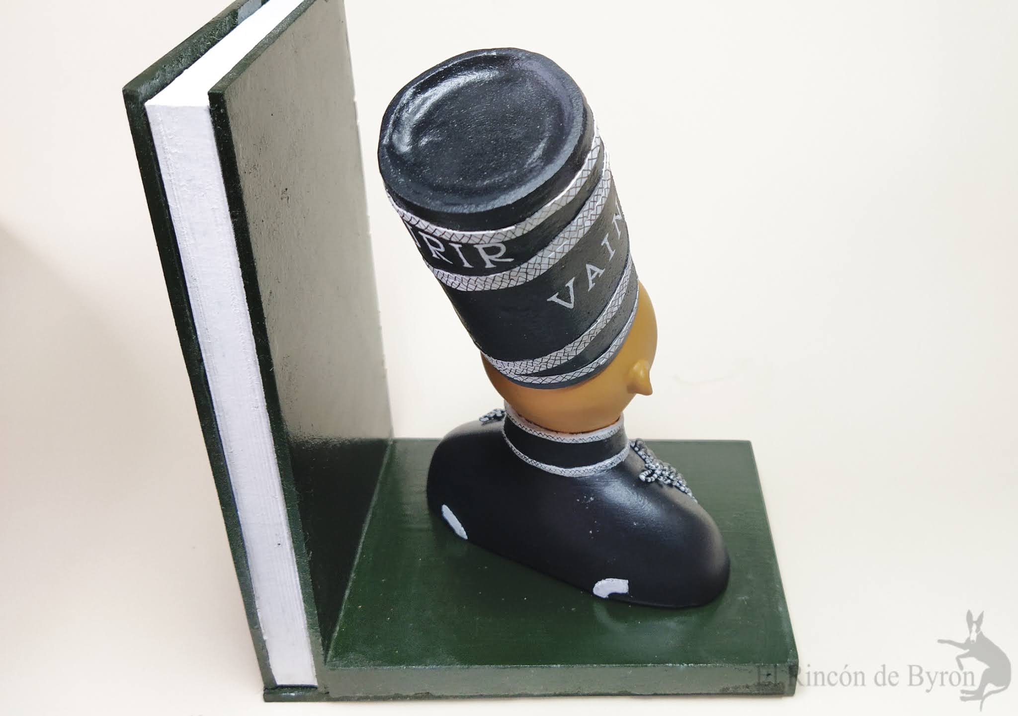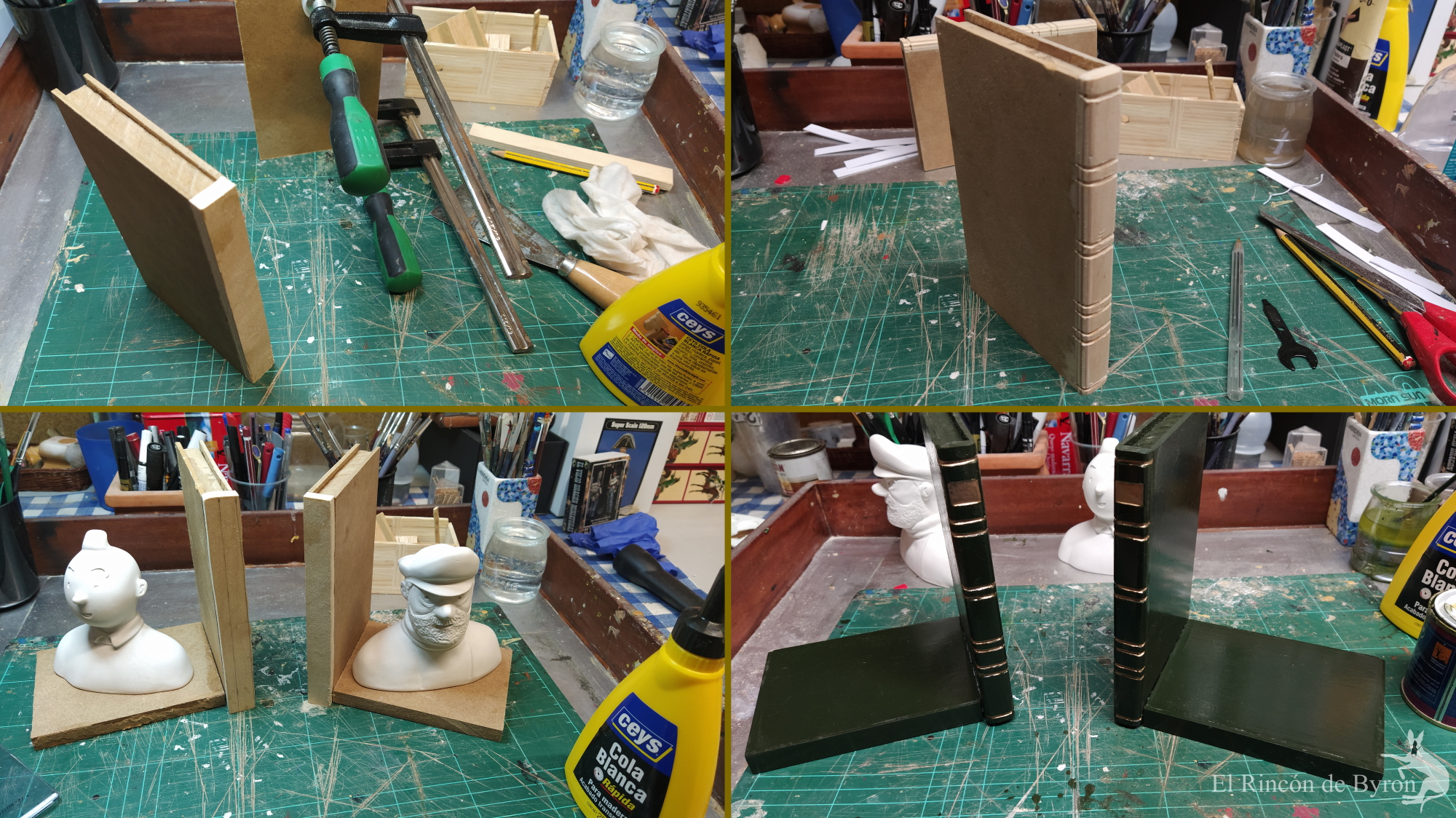 Lo primero era realizar el cuerpo de los sujetalibros, aprovechando tiras de DM y algun perfil de madera suelto. Para asemejarlo al lomo de un libro de época, lo vamos redondeando y ferfilando con la herramienta de Dremel, indispensable para este tipo de manualidades, y que también nos permite horadar las hendiduras horizontales del lomo. Posteriormente pintamos con esmalte de un color verde oliva todo el cuerpo del sujetalibros, y con pintura dorada también de esmalte las hendiduras del lomo y la superfície donde irá el año.