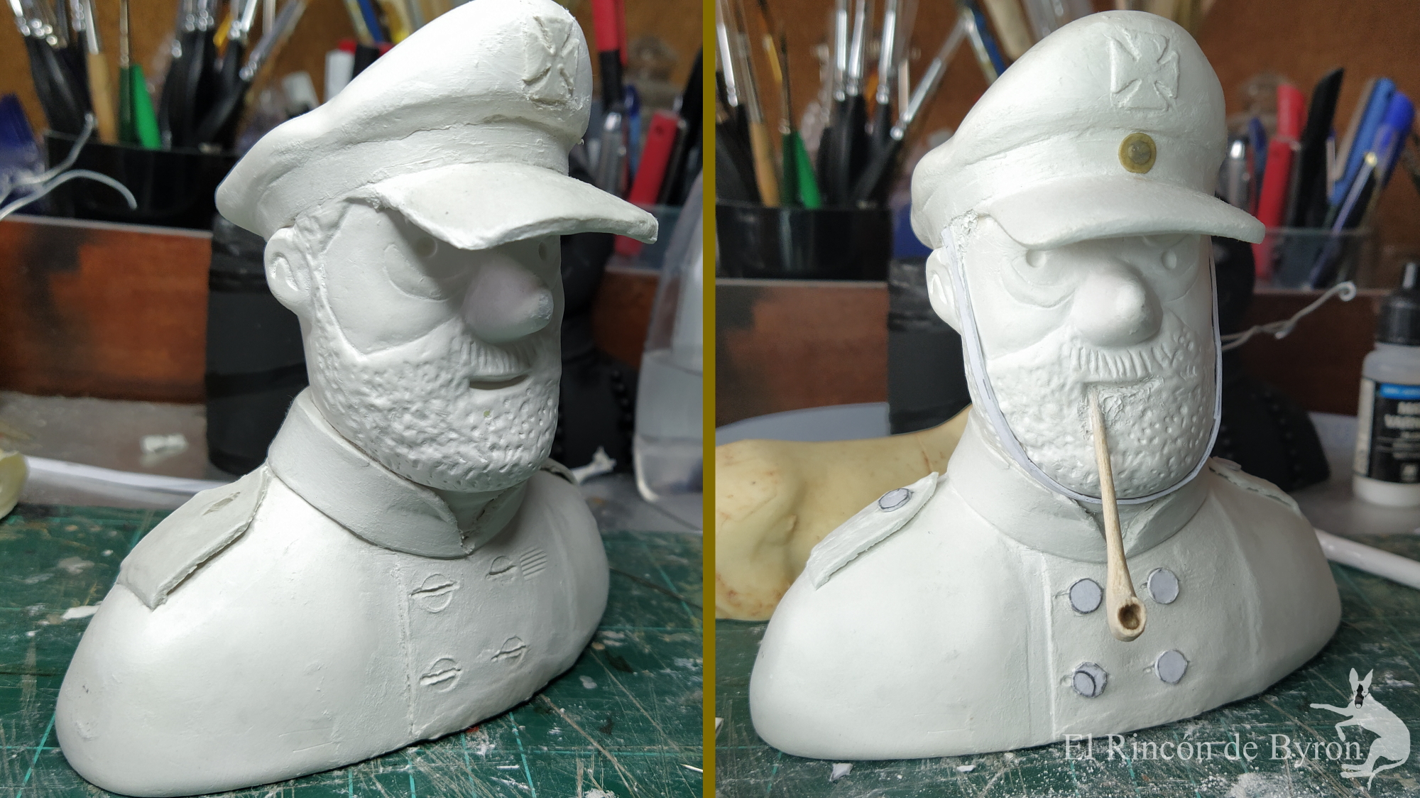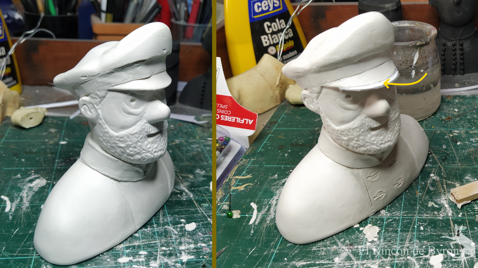 Las gorras de la Landwehr (Schirmütze, una gorra de tela con visera) son relativamente fáciles de representar, pero hubo que modificar la original para que cupiera la banda que discurre alrededor por encima de la visera y que normalmente llevaba los colores de la provincia. La misma visera también la tuvimos que modificar y alargar, añadiendo una pequeña lengüeta de cartulina por debajo para poder tener un apoyo más consistente para la masilla. El cuello también lo modificamos sin mayor inconveniente, recortando parte de la escayola del cuello original con el Dremel (con la consabida polvareda, por lo que hay intentar tener un lugar ventilado para hacerlo y que sea fácil de limpiar, para evitar polémicas familiares posteriores).