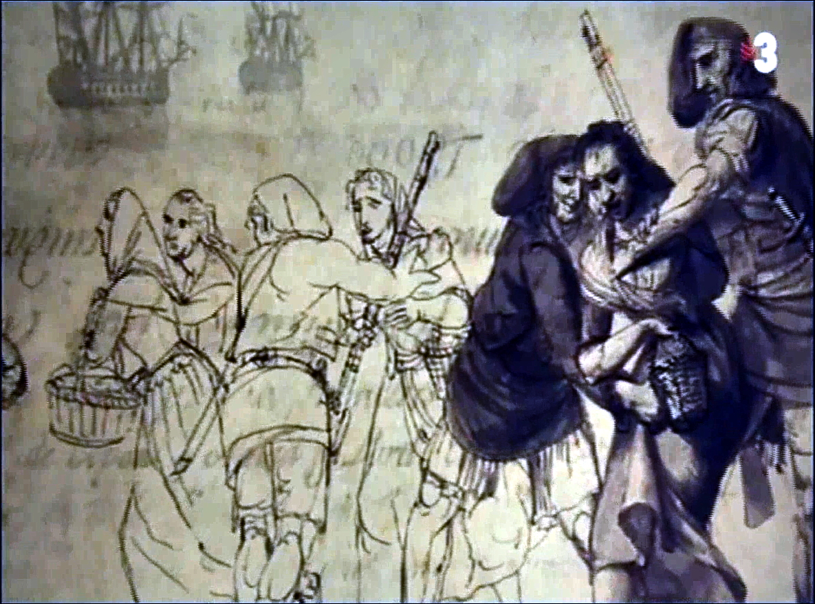 Narr.: Un grupo de notables, la Junta de Cataluña que tendrá que cambiar de lugar 21 veces durante la guerra, intentaba coordinar los esfuerzos bélicos. Napoleón acabaría dominando las grandes ciudades, pero nunca el interior del país y las comunicaciones. La peor parte de la guerra se la llevó el campesinado, con saqueos constantes.