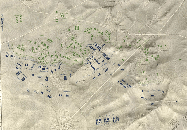 En efecto, era d\’Erlon. Una orden mal redactada le había ordenado que dirigiera su marcha sobre \»Wagnée\» en lugar de \»Wagnelé\»; de ahí su llegada al lugar completamente equivocado. Además, no había tenido en cuaneta enviar jinetes de avanzada para advertir a las tropas amigas de su llegada. Así que la sorpresa resultante no solo retrasó un ataque crítico, sino que hizo que la izquierda francesa (bajo Vandamme) se pusiera decididamente nerviosa, por lo que la Joven Guardia tuvo que desplegarse para reforzarlos, y en un momento el general Lefol se vio obligado a girar su propia artillería sobre sus hombres presa del pánico mientras abandonaban la línea.
