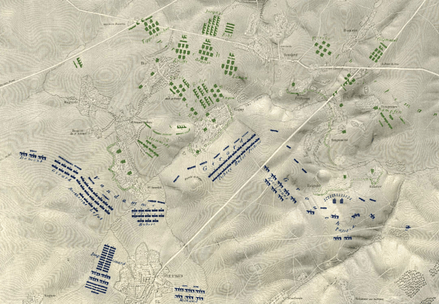 La batalla: El inesperado despliegue adelantado del ejército de Blücher que se alineó la mañana del 16 esperando su asalto hizo que fuera una batalla muy oportuna para Napoleón. Los prusianos habían basado su defensa a lo largo del Ligny, un arroyo pequeño pero pantanoso que era difícil de cruzar excepto en sus cuatro puentes. Se habían preparado e incorporado diez aldeas y arroyos a la línea de defensa, lo que ayudó a cubrir los cuatro puntos de enlace y, por lo tanto, negárselos a Napoleón. La elevación del terreno en la parte trasera constituía una posición ventajosa para las columnas prusianas de soporte.