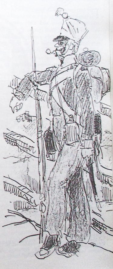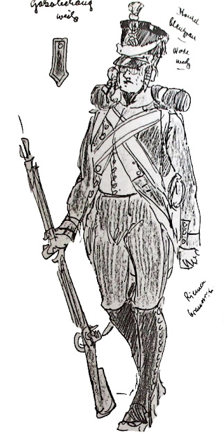Scharf nº 132. Soldado de Saxe-Altenburg en España, 1808 (?). A consultar la fecha. La escarapela es negra, con bordes amarillos; el pompón y el plumero rojo; las cuerdas del chacó son blancas; y la placa, al parecer, las armas ducales en latón. El abrigo está en el nº 119 pero el diseño y el color de las correas están definidos con mayor precisión. Los pantalones azules tienen franjas rojas claras. Las notas también mencionan el rollo de abrigo azul grisáceo, el chaleco blanco y la eslinga del mosquete de color marrón rojizo.