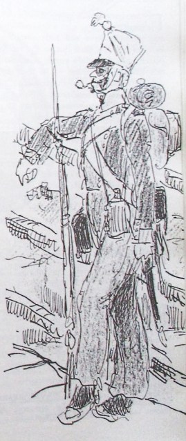 Su compañero de tertulia replicó que, casualmente, él también estaba interesado en los uniformes alemanes antiguos; y en aquel momento llevaba con él en su maletín una colección de antiguos dibujos coloreados que eran un tesoro familiar. Llevaba un cuaderno de bocetos conteniendo dibujos hechos por un antepasado durante las guerras napoleónicas, que había intentado llevar al Zeughaus1 de Berlín o alguna otra institución similar para su evaluación.