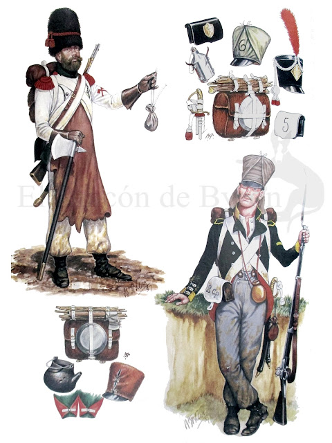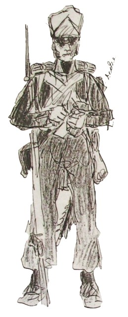 Arriba: Scharf nº 113: Oficial no comisionado (NCO) del Schwarzburg Rudosltadt en España, 1809. Puede ser un sargento o un cabo. Las notas se refieren al rollo de la mochila, la funda del chacó y los pantalones son todos de un uniforme marrón beige pálido; y al frente liso de la casaca. El equipo y las correas de la mochila son de color negro, al igual que las polainas; los tirantes de color verde liso; y el calzado marrón claro.