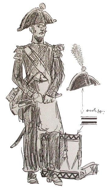 Scharf nº 122: Tambor de Saxe-Altenburg en España, 1809. Las notas muestran que en el último cuaderno de bocetos había un segundo dibujo de un tambor con una decoración del aro del tambor más elaborada y alternativa, como se muestra en los detalles de la derecha. Este es un uniforme extrañamente pasado de moda, y curiosamente está decorado con ambas charreteras con flecos de estilo francés y puente rojo con franjas blancas.