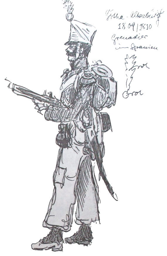 Scharf nº 136. Granadero de Saxe-Altenburg en España, 1809-1810. Aparentemente vistiendo el uniforme con carteras rojas en los puños y charreteras con flecos rojos; la dragona del sable también es roja. Lleva colgando de la mochila una sartén de acero para cocinar.