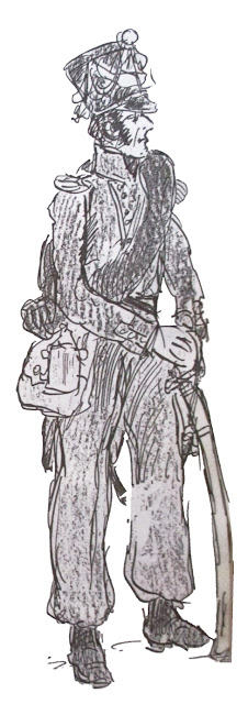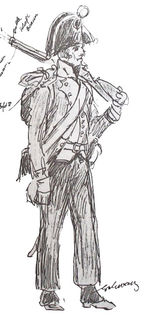 El origen de dichas ilustraciones salió a la luz por una rocambolesca historia en la que se vio involucrado el artista militar Ludwig Scharf, en plena Segunda Guerra Mundial con un oficial del ejército alemán. Nuestra entrada de hoy trata sobre dicha historia y también de algunas muestras de ilustraciones de soldados de algunos de los territorios de la Confederación del Rin que participaron en nuestra contienda, así como una ilustración en color de Bryan Fosten, a partir de los apuntes de Scharf.