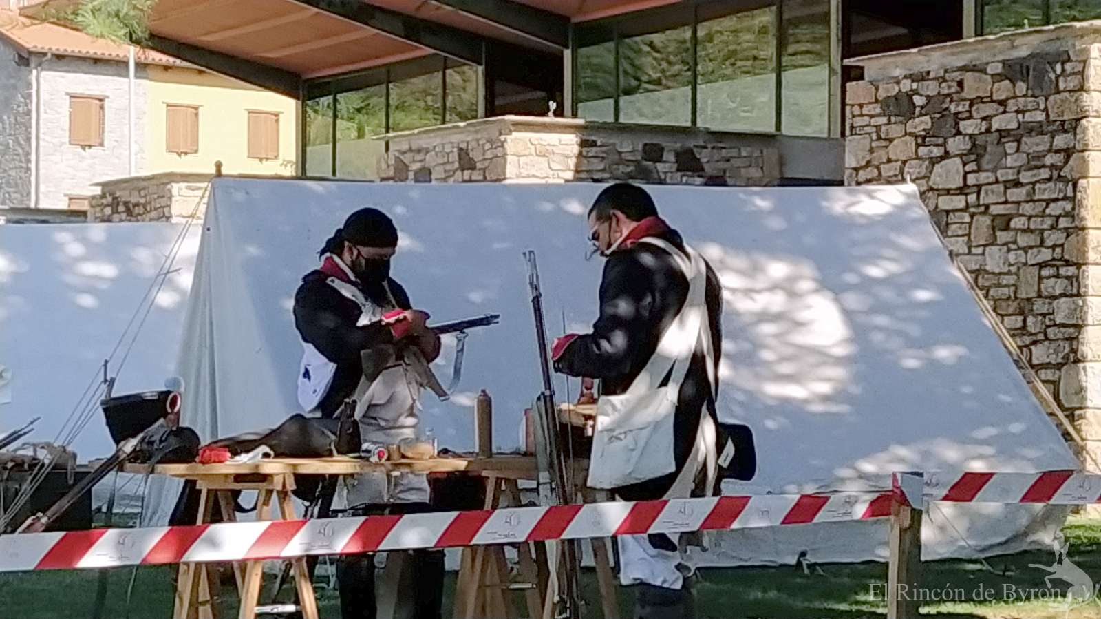 «Este fusil es concretamente un Charleville, por la fábrica donde los hacían en el norte de Francia, más o menos comienzan a producir estas armas y comienzan a utilizarlas a partir de 1730 y su uso llega aproximadamente hasta 1840, aproximadamente unos 100 años. Este concretamente es un Charleville modelo del Año IX. Poco a poco se fueron haciendo pequeñas modificaciones, sobre todo en esta pieza de aquí que se llama llave. Esta llave es conocida como de “miguelete”, es la típica llave que se hacía aquí cerca, en Ripoll. Anteriormente en lo que sería la Guerra de los Segadores, en vez de hacer servir este tipo de armas, tenían una similar, pero iba con mecha y eran mucho más decoradas. Este tipo de armas el problema que tienen básicamente tiene tres problemas: el primer problema que tiene de todos es que es poco fiable. Se dispara una bala que es muy pequeña y cuando se dispara, al ser liso el cañón, va rebotando y es muy poco precisa y acaba rebotando, se va para aquí, se va para allá, arriba o abajo. Pensad que aproximadamente se disparaban a unos 100 metros; menos de 100 metros, yendo en grupo, no servía para nada. Una persona individual para tocar a otra, todos hemos visto estas películas de los héroes aquellas películas que viene un hombre a caballo, que está casi a un kilómetro, coge un fusil, apunta, dispara y cae del caballo… todos las hemos visto: todo eso es mentira. Para poder disparar y que fuera más o menos preciso, aproximadamente habría de estar a menos de 100 metros. Más lejos no acertaban ni en broma. Para cargar esta arma, tiene este tubo de aquí, que normalmente es liso, que es donde se carga el proyectil. Y esto funciona con esta pieza pequeña de sílex que tenemos aquí, esta pequeña chispa hace ignición en la pólvora que tenemos en la cazoleta, entra dentro el fuego y sale disparado por delante. Marc ahora os lo demostrará. Pone pólvora en la cazoleta, la carga por arriba… En este momento, antes de poner la baqueta y empujarlo todo es cuando ponían la bala. Pero nosotros no disparamos con bala, evidentemente porque nos podríamos hacer daño. Lo que hace ahora es baquetar… Si tuviéramos la bala y la disparáramos sin atacar hasta el final, el problema es que habría un espacio entre la bala y la pólvora y lo que podría llegar a provocar es que reventara el tubo por dentro.»