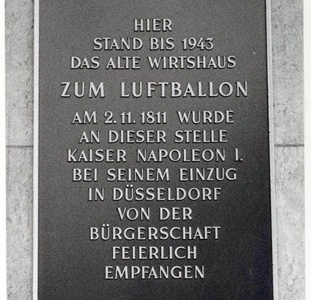 The emperor left Wesel at 7 o’clock in the morning and accompanied by the mounted guard of honour, crossed the border from the Empire to the Grand Duchy. All along the way, bells rang and (ordered) cheers accompanied him. Everywhere provisional triumphal arches were set up. In Duisburg there was a stopover with a reception committee, breakfast and eulogies. Around 11 o’clock the emperor and his entourage reached the outer outskirts of Düsseldorf at the restaurant «Luftballon«[1] (at the corner of Nordstraße and Kaiserstraße). There he was welcome by the authorities.