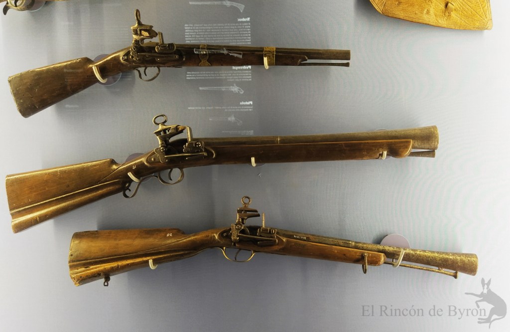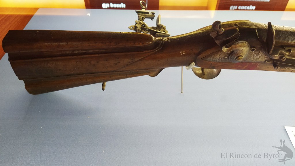 Trabuco – El trabuco es un arma de fuego portátil más corta que la escopeta, pero más amplia. El cañón, de gran calibre, se va abriendo progresivamente desde la mitad hacia la boca, cosa que le permite escampar más, y en más cantidad, los proyectiles. Se utilizaba también para la caza a corta distancia.