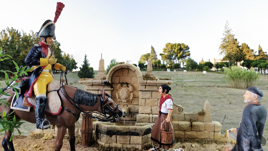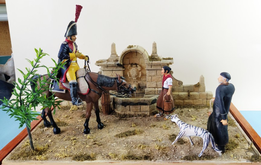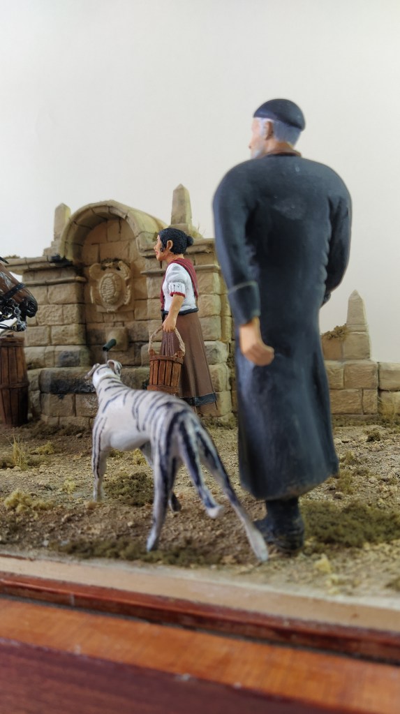 Volvemos al universo de las miniaturas con este pequeño proyecto de escena que hacía tiempo que lo venía planeando, aunque no con este aspecto final. La escena tiene como base una fuente (que no deja de ser un motivo recurrente en los dioramas, sobretodo las de planta circular), una lugareña yendo a buscar agua y un soldado. El párroco lo añadimos a posteriori como el galgo español que le acompaña.
