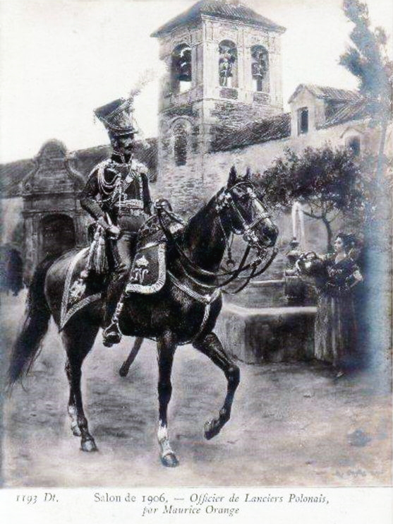 Finalmente como motivo escogimos a un jinete del ejército francés, tomando como inspiración una obra de Maurice Orange (ver imagen derecha). No sería un lancero polaco, a pesar de su historial en España, sino un gendarme a caballo.