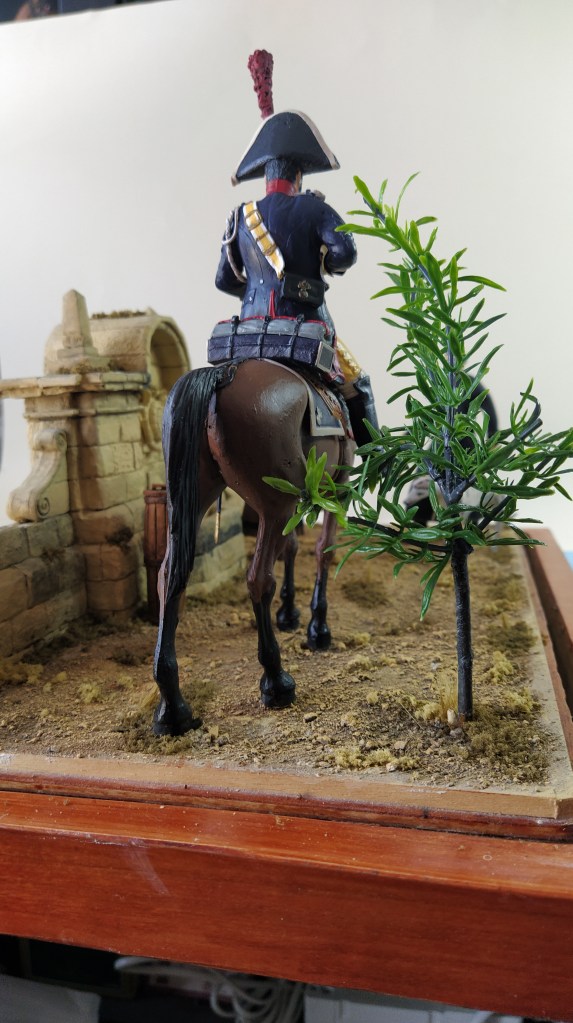 La base de la figura es un dragón a caballo de la marca MiniArt (el uniforme es parecido al de los gendarmes), que modificamos en su postura, ya que el dragón originalmente está apuntando su carabina, lo que también nos creó otro problema, ya que tenía uno de los dos ojos cerrados. Utilizamos masilla EPOXY PUTTY, de la marca Tamiya (la rápida, de colores marrón y blanco) para los pliegues de la casaca, galones de la manga y el ojo abierto. Rellenamos las uniones de los pantalones y botas (estas figuras de MiniArt vienen con cuatro piezas para estas partes, lo que es un claro inconveniente a la hora de montarlas). El bicornio es una pieza clonada de un bicornio de general de otra figura de Verlinden, a la que añadimos la escarapela (nos ha quedado más grande de lo que debería) y con lámina de estaño hacemos la cinta del reborde del sombrero.
