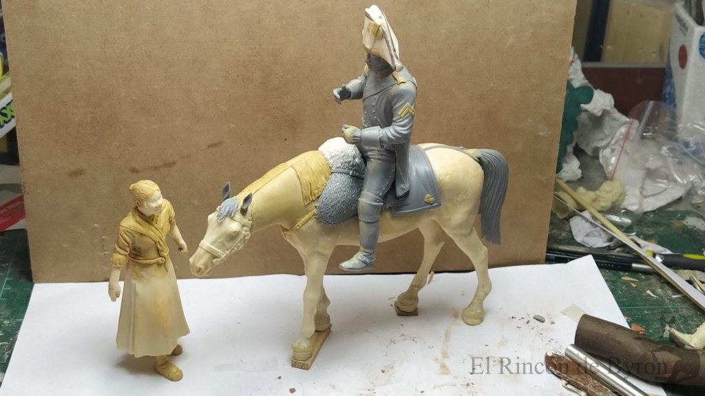 La muchacha la realizamos a partir de una figura clonada de cantinera (la Vivandière, de Verlinden) con los brazos clonados a partir de una figura femenina diferente, ya que los de la cantinera no nos servían por estar con una angulación diferente a la que queríamos. Otra vez masilla de Tamiya para realizar el vestido, la camisa y el pañuelo en los hombros. Esta masilla se trabaja relativamente bien y endurece en un periodo de tiempo razonable. El inconveniente que se nos presenta es el que es algo pegajosa y se pega a los dedos, pero humedeciéndolos un poco previamente se resuelve bastante bien el problema.